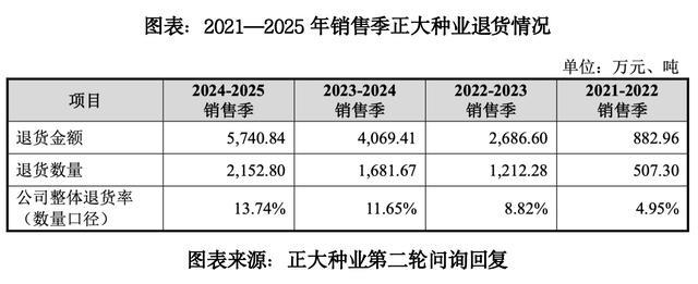第二轮问询回答文献炫夸,跟2021—2022年销售季比拟,2024—2025年销售季梗直种业的退货率从4.95%升至13.74%,退货金额从882.96万元增至5740.84万元。